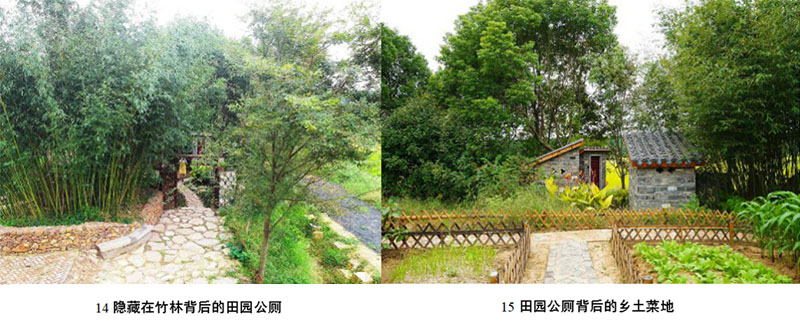 田园公厕位于垄上观田节点南侧,设计结合南侧竹林布置公厕,每个公厕隐于竹林中,保持较好的私密性;材料上选取红砖、青瓦等乡土材料。临田一侧的洗手台墙面运用十字形镂空砖砌手法,确保观田视线通透,营造出乡土味十足,自然野趣的田园公厕。