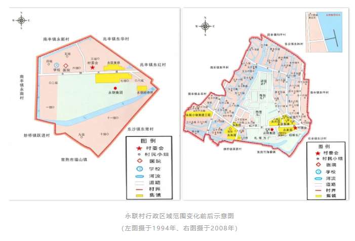 1993年,永联村对全村进行第二轮总体规划,将总面积0.55平方千米的永联村规划建成“五区一场”,即工业生产区、生活娱乐区、文卫教育区、村民住宅区、商业贸易区和特种养殖场。此时,永联居民小区围绕厂区而建,建造多层住宅、两层别墅和一层老年住宅,田间地头的分散式居住开始呈现集中式居住空间形态。1995年,邻近永新和永南两村被划入永联村,人口从900多人增加到5331人,增加了5.9倍,面积从0.54平方公里增加到4.52平方公里,增加了8.2倍,成为苏州村域面积最大、人口最多的行政村。